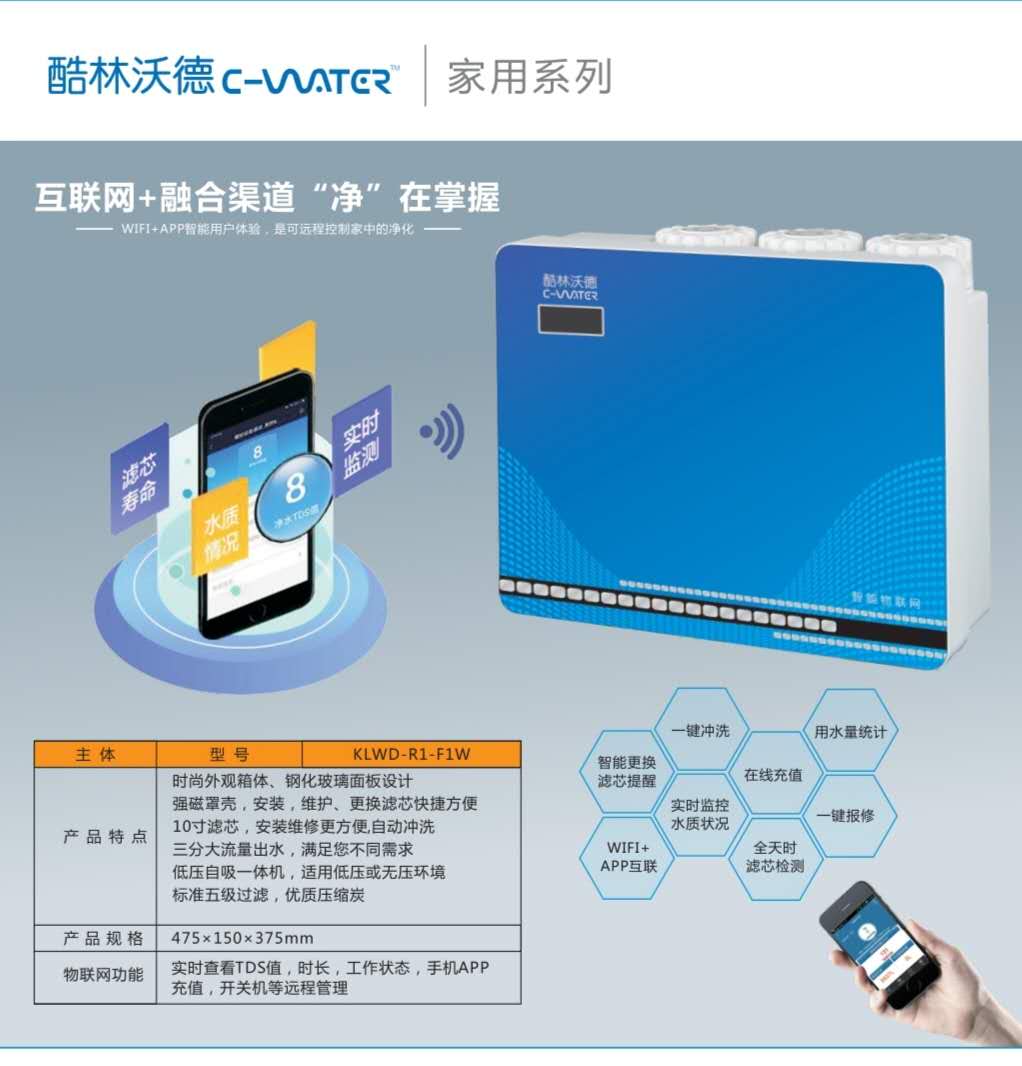 终端净水器的选择是很重要的,酷林沃德净水机采用了逆渗透技术,又称RO膜技术,是当今最先进、最有效的膜分离技术。其原理是在膜的一端施加压力作用下,依据其他物质不能透过逆渗透膜而将这些物质和水分离开来。由于逆渗透膜的膜孔径非常小,仅为0.0001微米,因此能够有效地去除水中的重金属、农药、细菌、病毒等;而且逆渗透膜并不分离溶解氧,因此产出的水是活水,不仅甘冽可口,而且避免了二次污染。